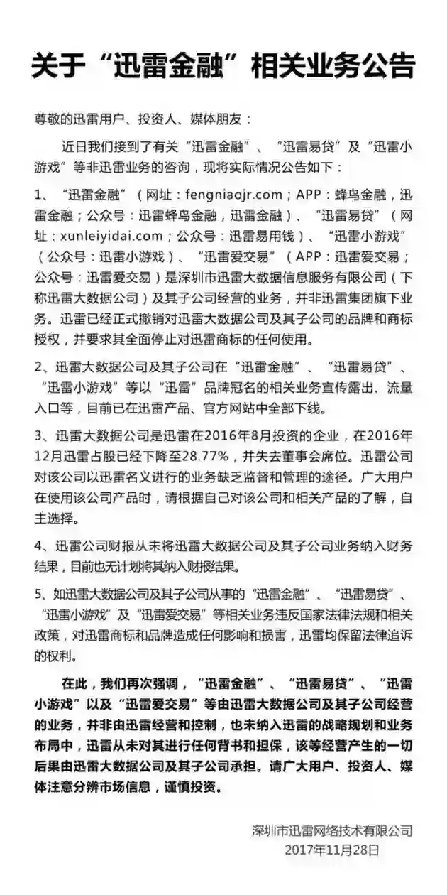 公告称,迅雷大数据公司及其子公司在“迅雷金融”、“迅雷易贷”、“迅雷小游戏”等以“迅雷”品牌冠名的相关业务宣传露出、流量入口等,目前已在迅雷产品、官方网站中全部下线。大数据公司及其子公司未纳入迅雷战略规划和业务布局中,迅雷从未对其进行任何背书和担保,经营产生的一切后果由大数据公司及其子公司承担。