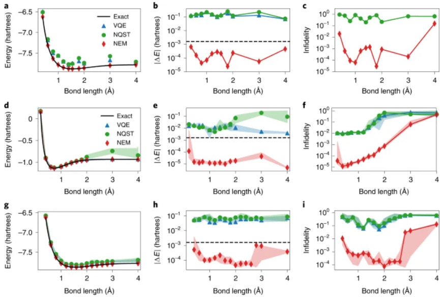 通过结合使用参数量子电路作为 ansatz 的 VQE,以及使用神经网络作为 ansatz 的 NQST 和 VMC,NEM 将两个参数量子状态族和三个关于其损失情况的优化问题结合在一起。研究人员提出了这些状态家族之间关系的性质、它们的损失情况和量子优势的问题。检查这些关系提供了一种新的方法来研究嘈杂的中等规模量子算法在寻求量子优势方面的潜力。这可能会促进在经典易处理的量子系统模拟和需要量子资源的模拟之间获得更好地划分。