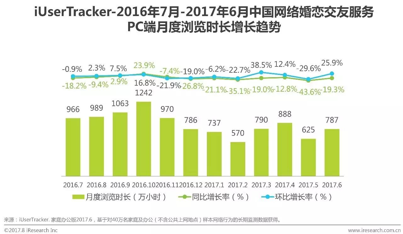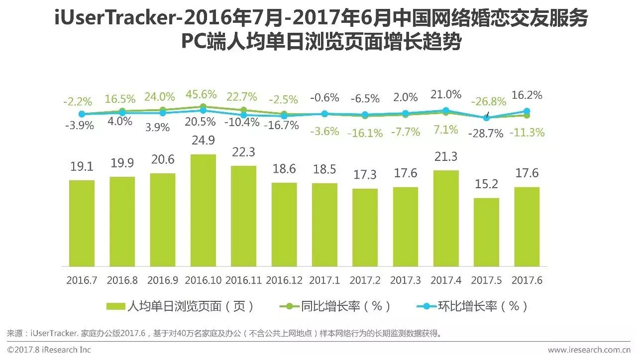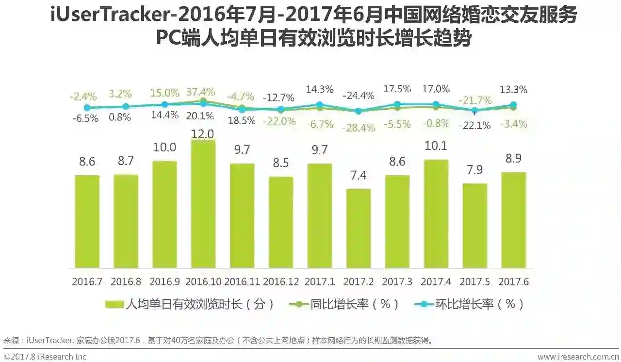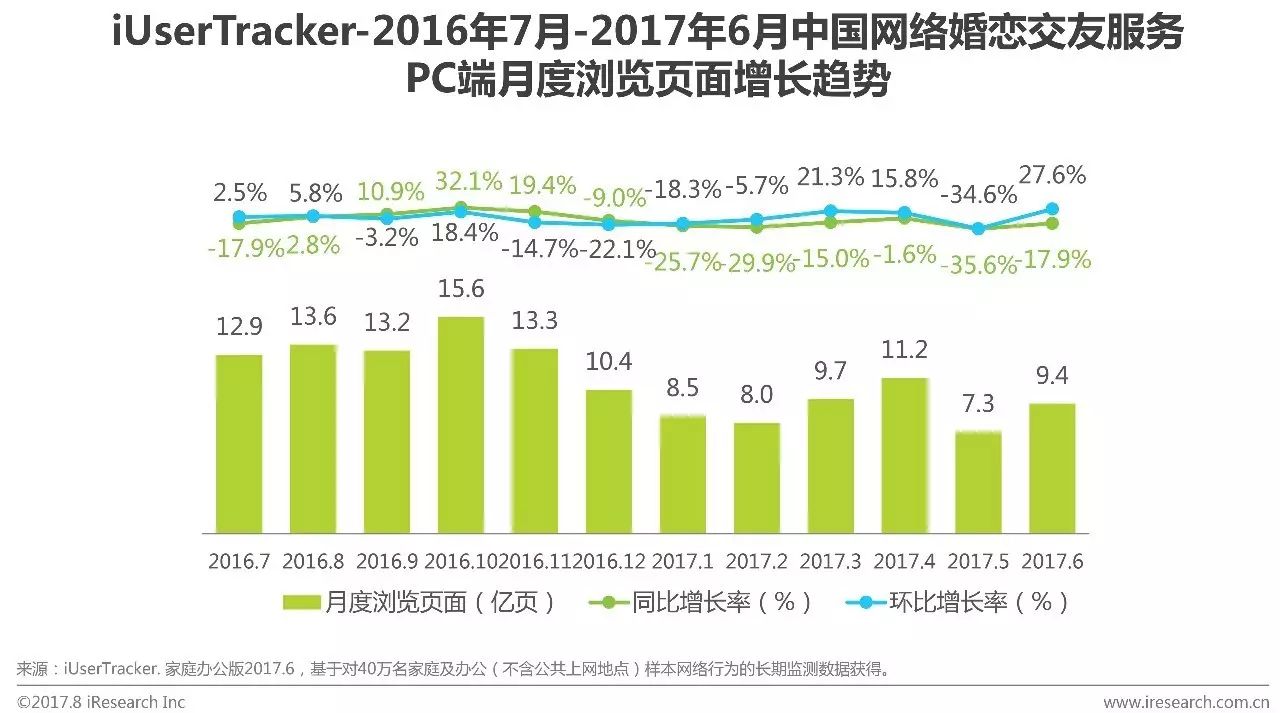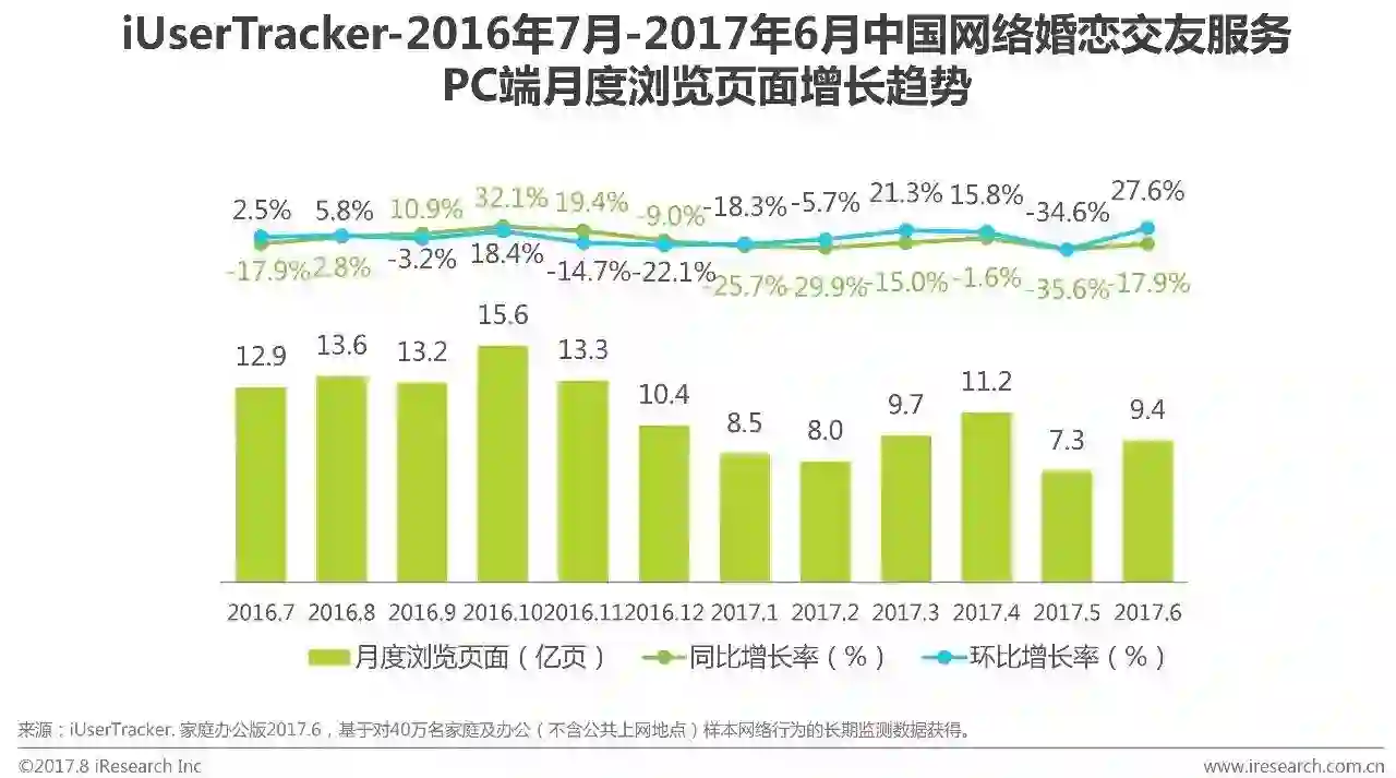 根据艾瑞咨询iUserTracker监测数据显示,2017Q2中国网络婚恋交友服务PC端月度浏览页面为11.2亿页、7.3亿页和9.4亿页。整体波动变化明显,受核心企业服务推广和产品更新影响较大。