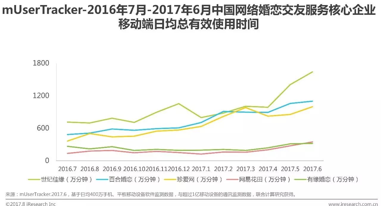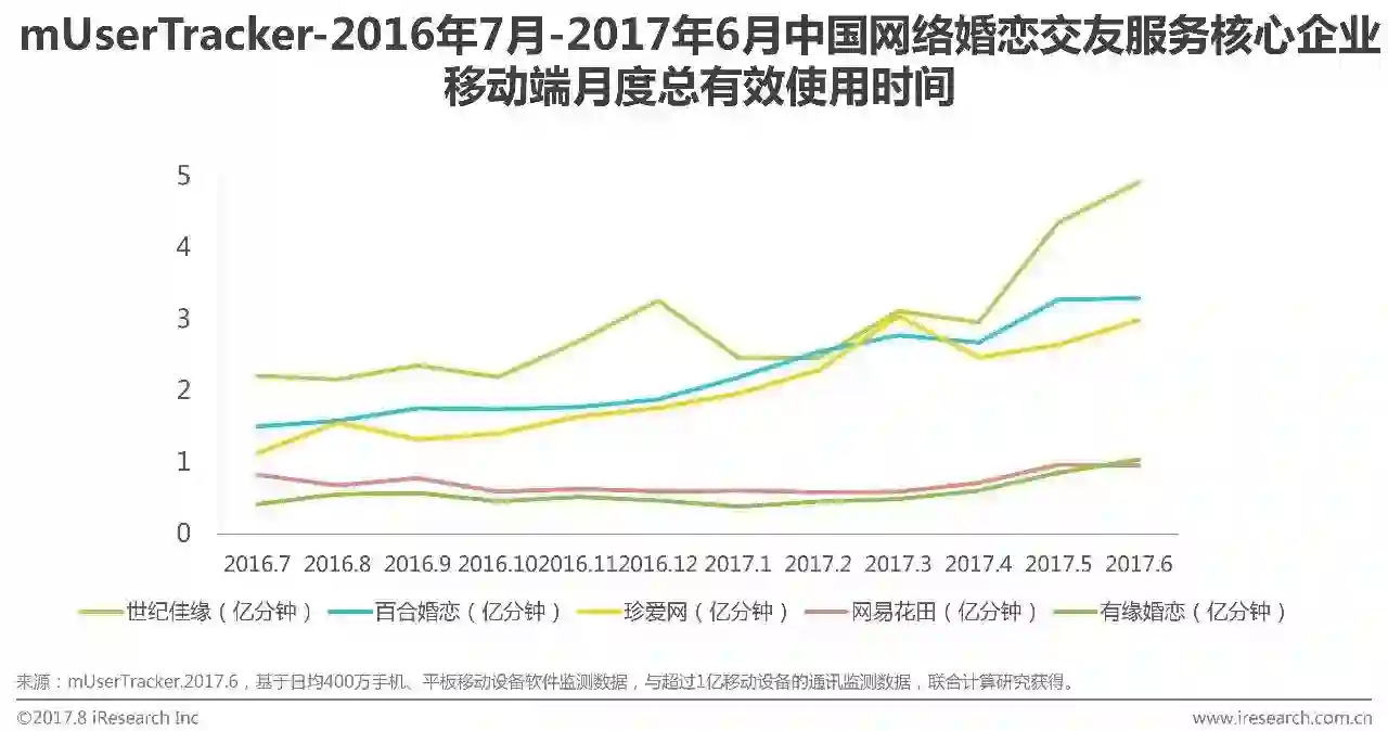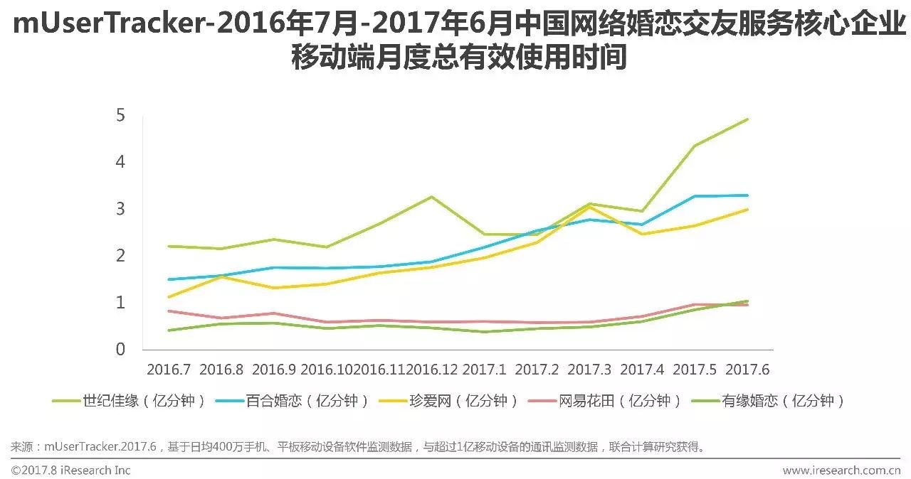 根据艾瑞咨询mUserTracker监测数据显示,2017Q2网络婚恋交友服务核心企业移动端月度总使用时间世纪佳缘大幅领先,其余核心企业也均保持增长。各核心企业6月月度总使用时长依次为世纪佳缘4.92亿分钟、百合婚恋3.30亿分钟、珍爱网3.00亿分钟、网易花田0.96亿分钟和有缘婚恋1.04亿分钟。