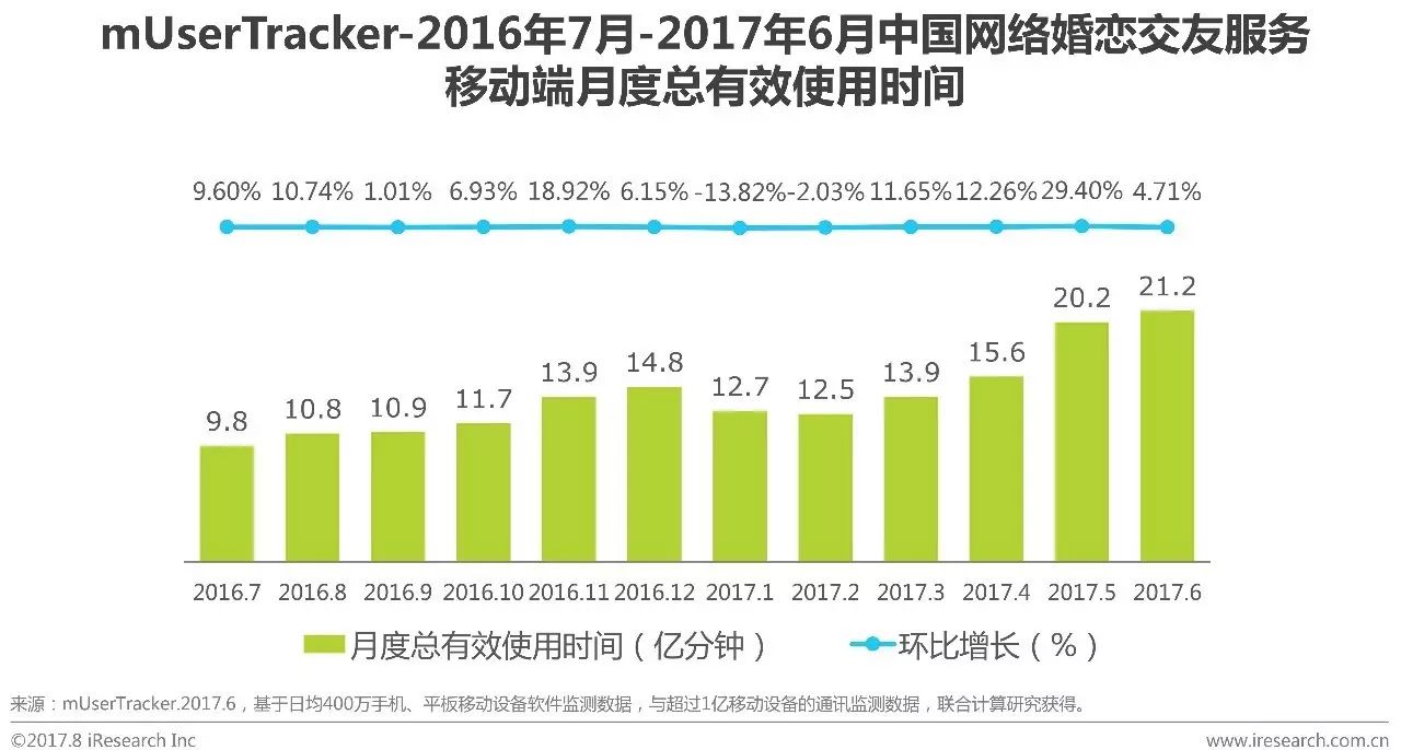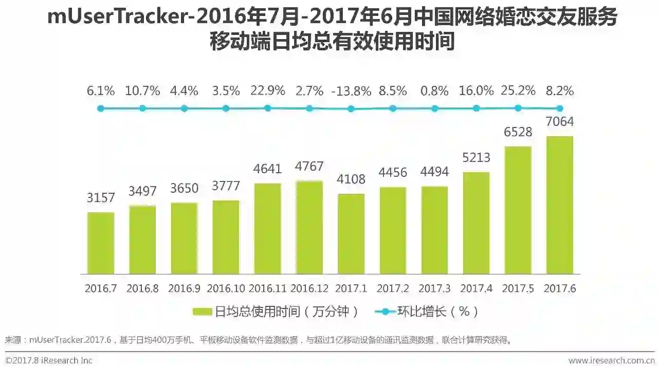 根据艾瑞咨询mUserTracker监测数据显示,2017Q2中国网络婚恋交友移动端日均有效使用时间持续增长,2017年6月日均有效使用时间达到7064万分钟,相较于2016年6月2859万分钟,同比增长147.1%。