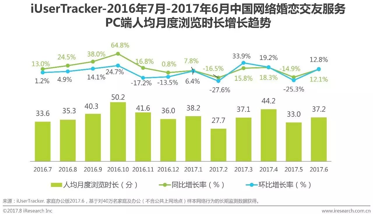 根据艾瑞咨询iUserTracker监测数据显示,2017Q2PC端婚恋交友服务的人均月度有效浏览时长分别为44.2分钟、33.0分钟和37.2分钟,同比增长依次为18.3%、-14.9%和12.1%,环比增长依次为19.2%、 -25.3%和12.8%,整体小幅降低。