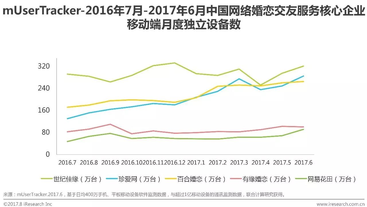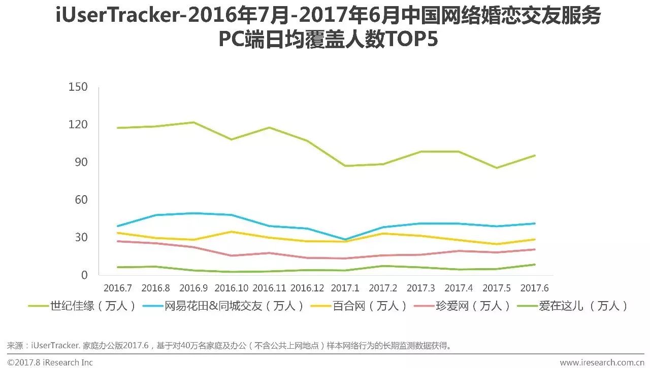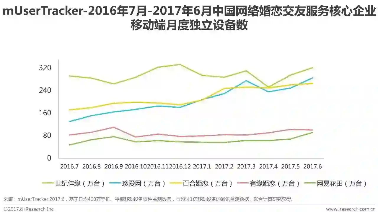 1. 2017Q2网络婚恋交友PC端月度覆盖人数增长趋稳,在经历PC端用户向移动端大量转移、移动端用户数量超过PC端用户数量、新增用户被移动端争夺后,现阶段网络婚恋PC端高粘性用户规模基本稳定。