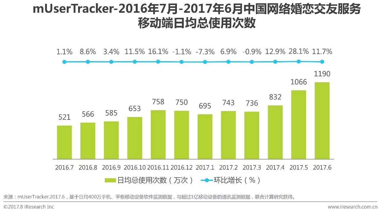 根据艾瑞咨询mUserTracker监测数据显示,2017Q2中国网络婚恋交友移动端日均总使用次数分别为832万次、1066万次和1190万次,环比增长分别为12.9%、28.1%和11.7%。