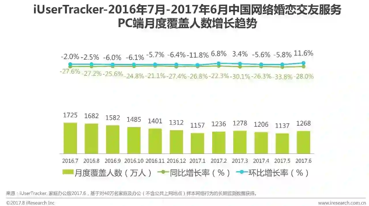 根据艾瑞咨询iUserTracker监测数据显示,2017Q2中国网络婚恋交友服务PC端月度覆盖人数依次为1206万人、1137万人和1268万人,同比增长依次为-26.3%、-33.8%和-28.0%,环比增长依次为-5.6%、 -5.8%和11.6%。