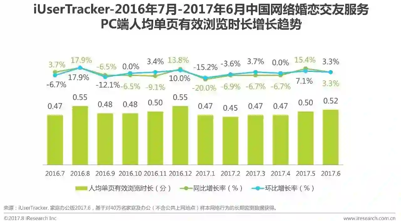 根据艾瑞咨询iUserTracker监测数据显示,2017Q2网络婚恋交友服务PC端人均单页有效浏览时长分别为0.47分钟、0.50分钟、0.52分钟。从整体来看,人均单页有效浏览时长保持小幅增长。网络婚恋PC端用户规模趋向稳定,但PC端服务不断丰富,对用户的吸引力增加,粗君人均单页有效浏览时长保持增长。