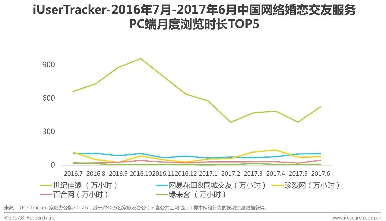 根据艾瑞咨询iUserTracker监测数据显示, 2017Q2中国婚恋交友服务PC端月度浏览时长依次为888万小时、625万小时和787万小时,环比增长依次为12.4%、-29.6%和25.9%。结合TOP5企业月度浏览时长增降变化趋势来看,行业整体月度浏览时长主要是受到世纪佳缘增降变化的影响而产生波动。