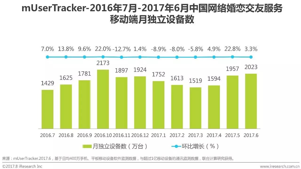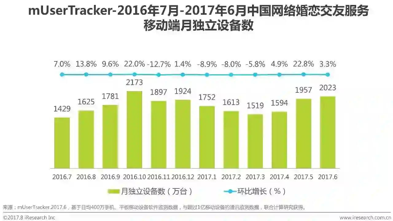 根据艾瑞咨询mUserTracker监测数据显示,2017Q2网络婚恋交友服务移动端月独立设备数依次为1594万台、1957万台和2023万台,从整体来看,保持持续增长。