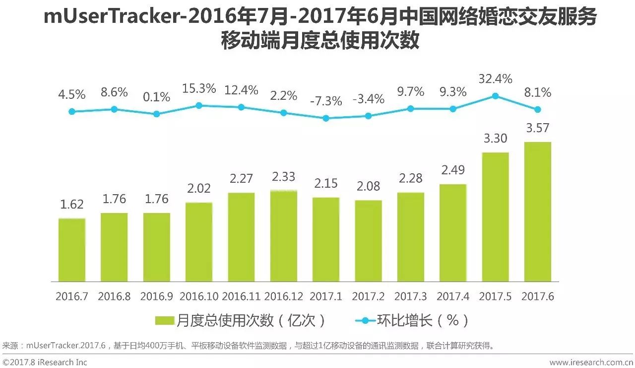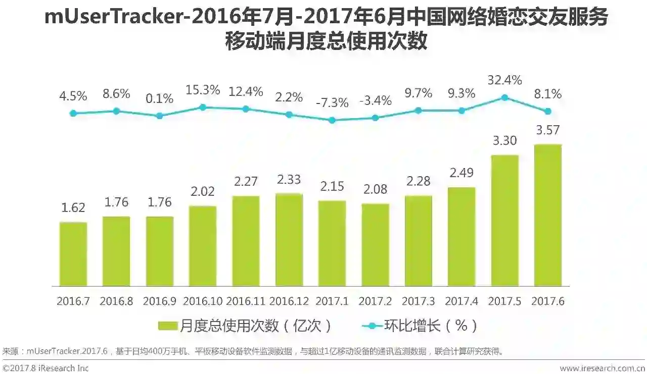 根据艾瑞咨询mUserTracker监测数据显示,2017Q2月度总使用次数大幅增长,其中6月达到中国网络婚恋交友服务移动端月度总使用次数峰值3.57亿次,此外,2017年4月和2017年5月月度总使用次数依次为2.49亿次和3.30亿次,2017Q2各月环比大幅增长依次为9.3%、32.4%和8.1%,