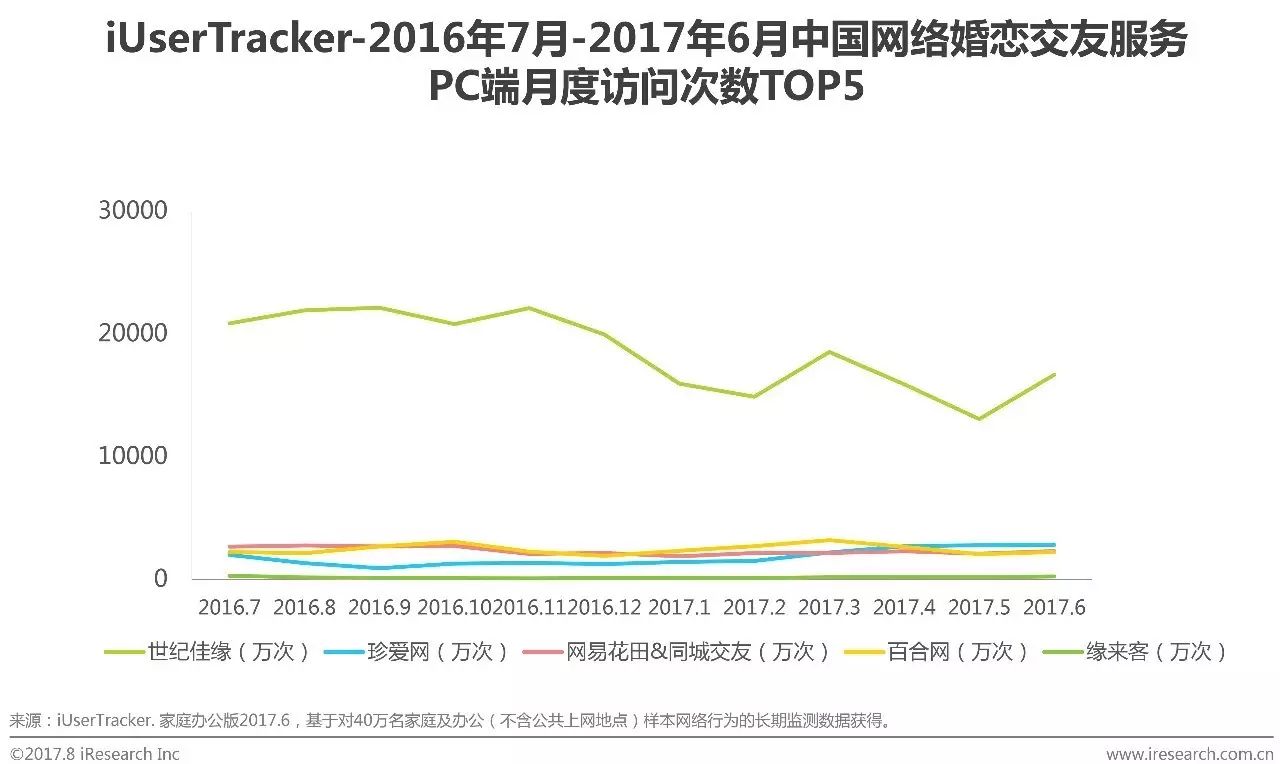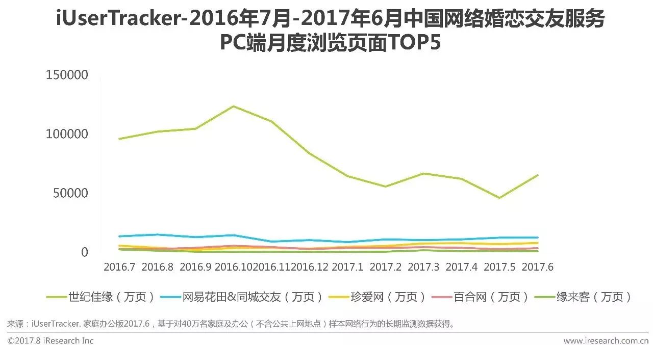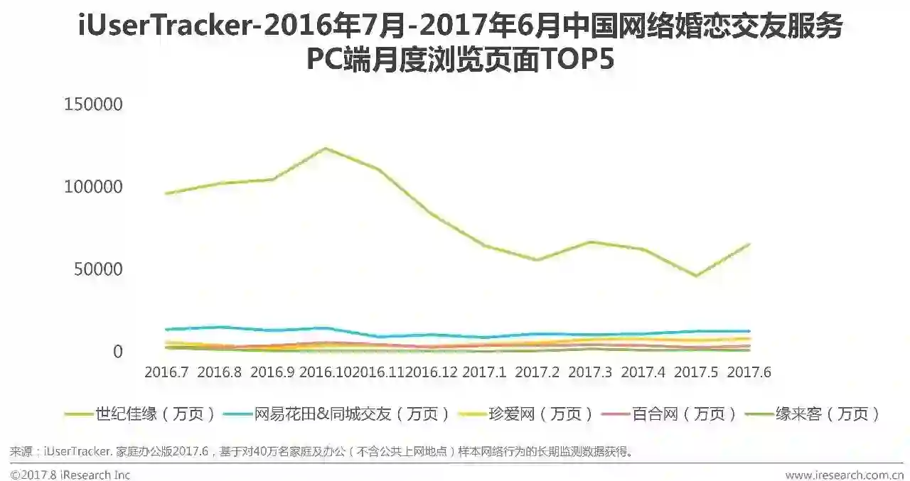 根据艾瑞咨询iUserTracker监测数据显示,2017年12月婚恋交友服务在PC端月度浏览页面TOP5的网站分别为世纪佳缘、网易花田&同城交友、珍爱网、百合网和缘来客。其中世纪佳缘由于受产品更新变化波动增长明显,其余TOP5企业月度浏览页面变化趋稳。