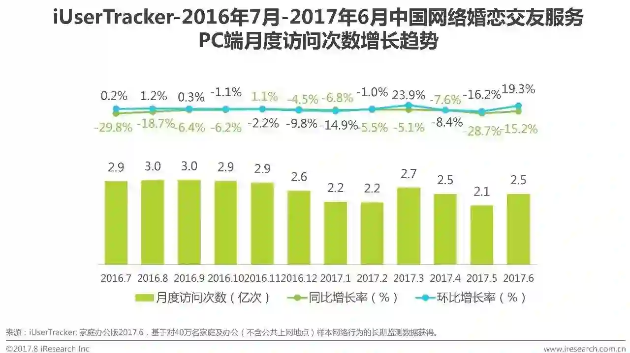 根据艾瑞咨询iUserTracker监测数据显示,2017Q2网络婚恋交友PC端月度访问次数分别为2.5亿次、2.1亿次和2.5亿次,月度访问次数从整体来看基本保持稳定但小幅波动变化。