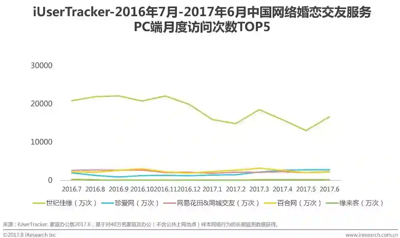 根据艾瑞咨询iUserTracker监测数据显示,2017Q2中国网络婚恋交友行业月度访问次数TOP5企业依次为世纪佳缘、珍爱网、网易花田&同城交友、百合网和缘来客,从整体来看TOP5企业月度访问次数基本保持稳定,用户使用习惯趋于稳定。