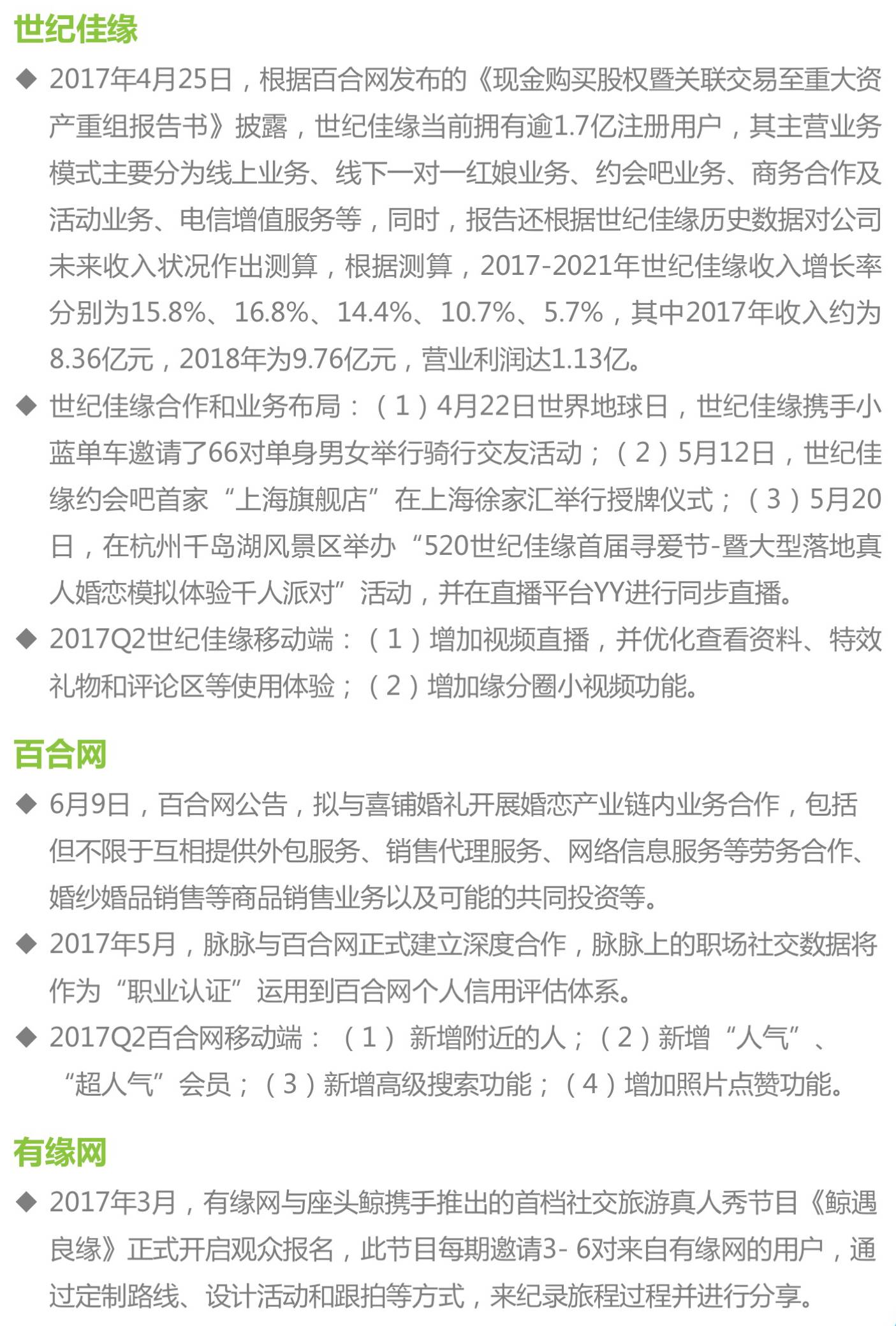 根据公开资料整理,网络婚恋交友核心企业近年资本运作频繁(1)2016年百合网连续募集资金,随后被宝新能源战略性收购,再然后投资布局婚礼、婚庆和金融等领域;(2)世纪佳缘通过百合网参股公司完成私有化;(3)珍爱网拟被德奥通航并购;(4)有缘网目前正在进行创业板IPO进程。未来网络婚恋交友行业竞争格局受资本的影响程度将进一步提升。