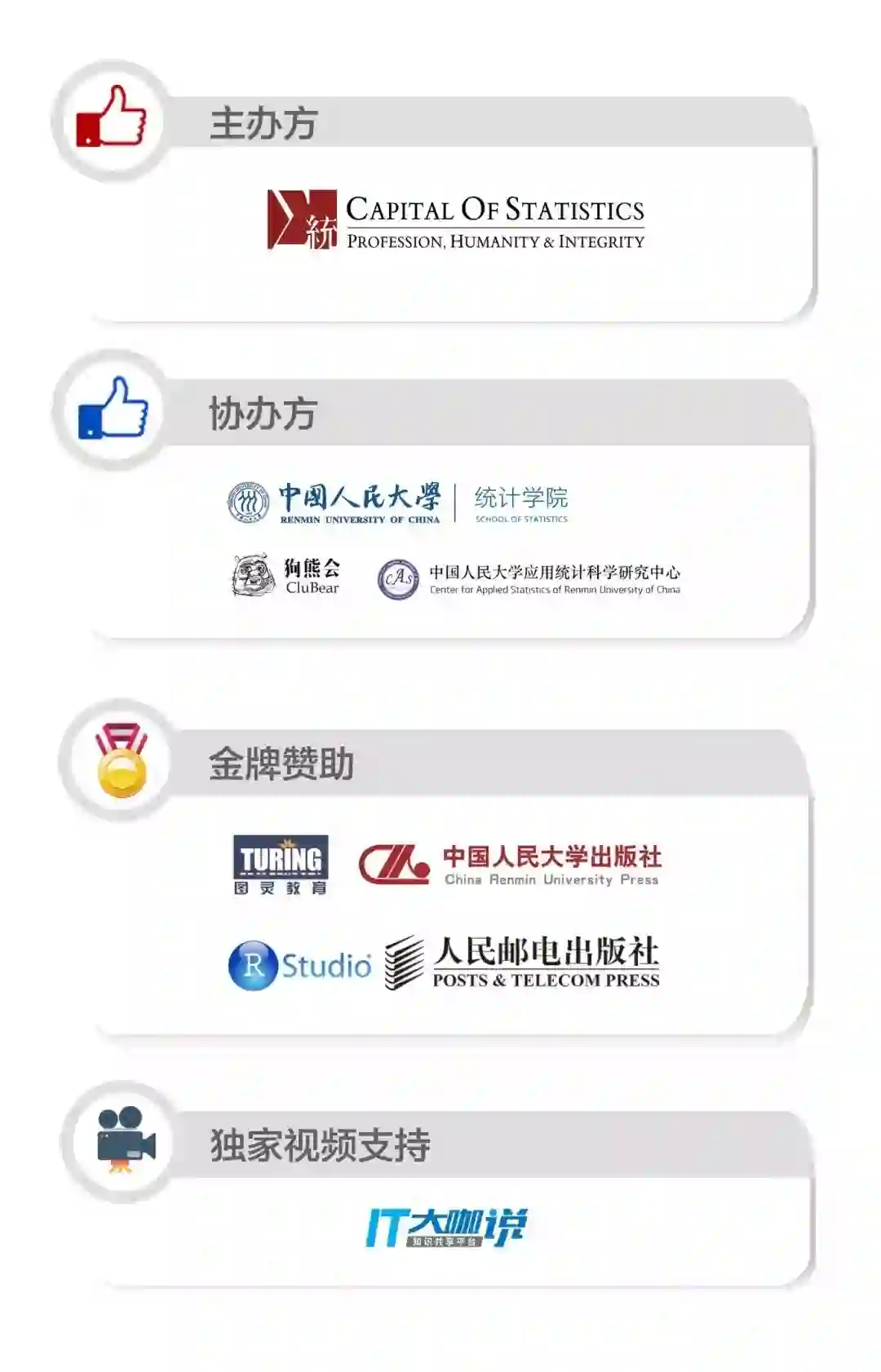 本次会议由统计之都主办,中国人民大学统计学院、中国人民大学应用统计科学研究中心、狗熊会协办,并得到 RStudio、人民邮电出版社、图灵教育、中国人民大学出版社的赞助支持以及 IT 大咖说独家视频支持。本届会议涵盖了多个学科领域,我们真诚地期待您的到来,一同感受数据科学为这个时代带来的惊喜与挑战。