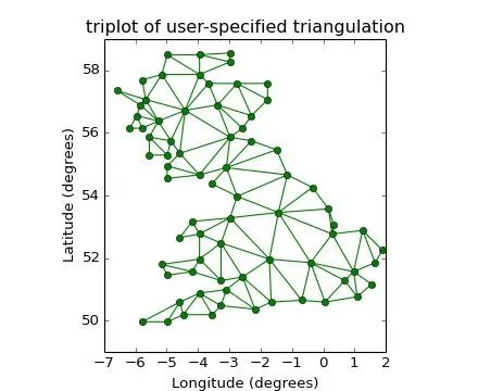plt.triplot(x, y, triangles, 'go-')plt.title('triplot of user-specified triangulation')plt.xlabel('Longitude (degrees)')plt.ylabel('Latitude (degrees)')