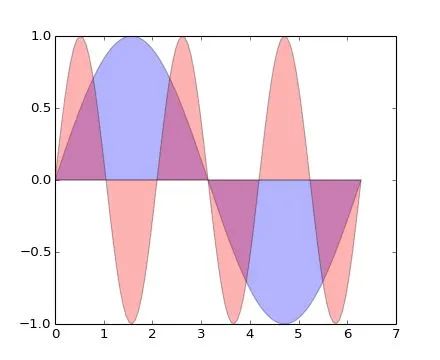 plt.fill(x, y1, 'b', x, y2, 'r', alpha=0.3)