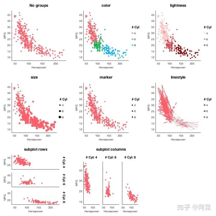 观察Mathematica、Origin、Python/matplotlib、R/ggplot2等软件绘制的数据、结果图,其与Matlab图的差异主要体现在点、线、面等对象属性(位置、尺寸、颜色等)的不同上。