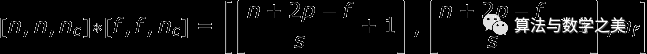接收张量的维数(即我们的三维矩阵)满足如下方程:n-图像大小,f-滤波器大小,nc-图像中通道数,p-是否使用填充,s-使用的步幅,nf-滤波器个数。