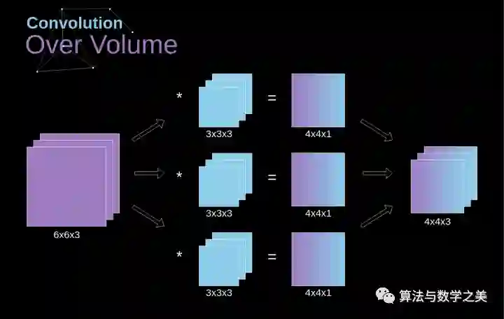 基本上,这种方式与图3中的示例非常相似,不过这次我们将三维空间中的值与卷积核对应相乘。