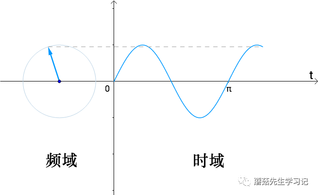 随着时间流逝,t从0开始增长, 这个向量就会旋转起来, 会转1周,也就是 。随着圆周的运动,我们把 向量的「虚部」记录下来(也就是纵坐标),得到的就是 ;在时间轴 上,把 的虚部记录下来就是 。以此类推。