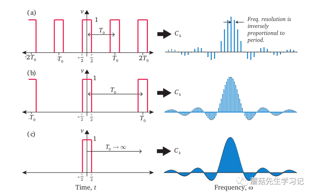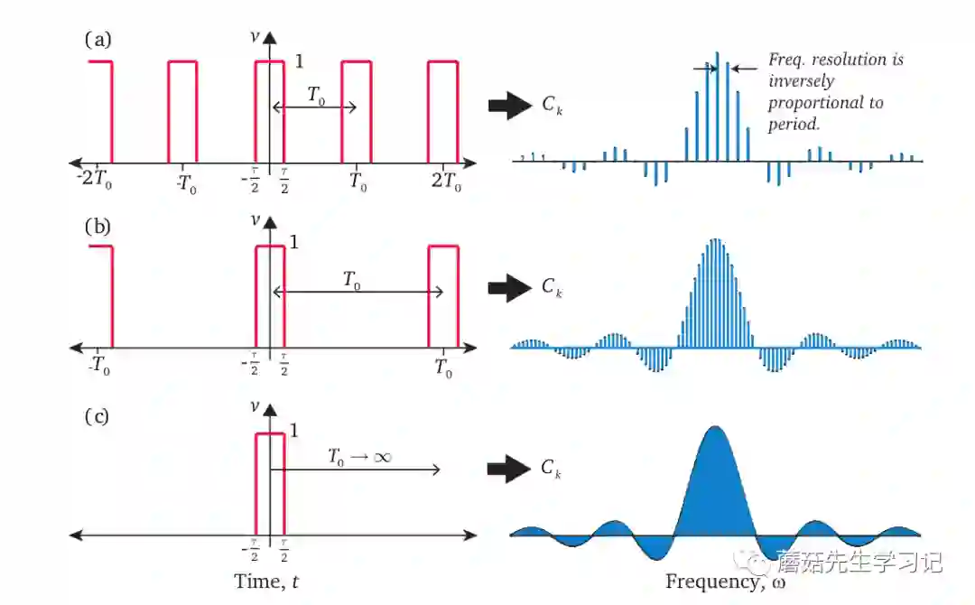实际上,周期越大,画出的频域图越密集,当 时,傅里叶级数就为傅里叶变换,此时频域图是「连续的曲线」。如下图: