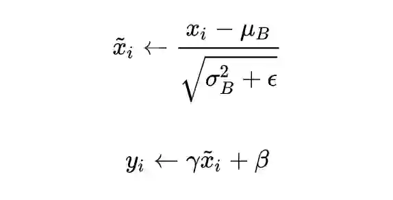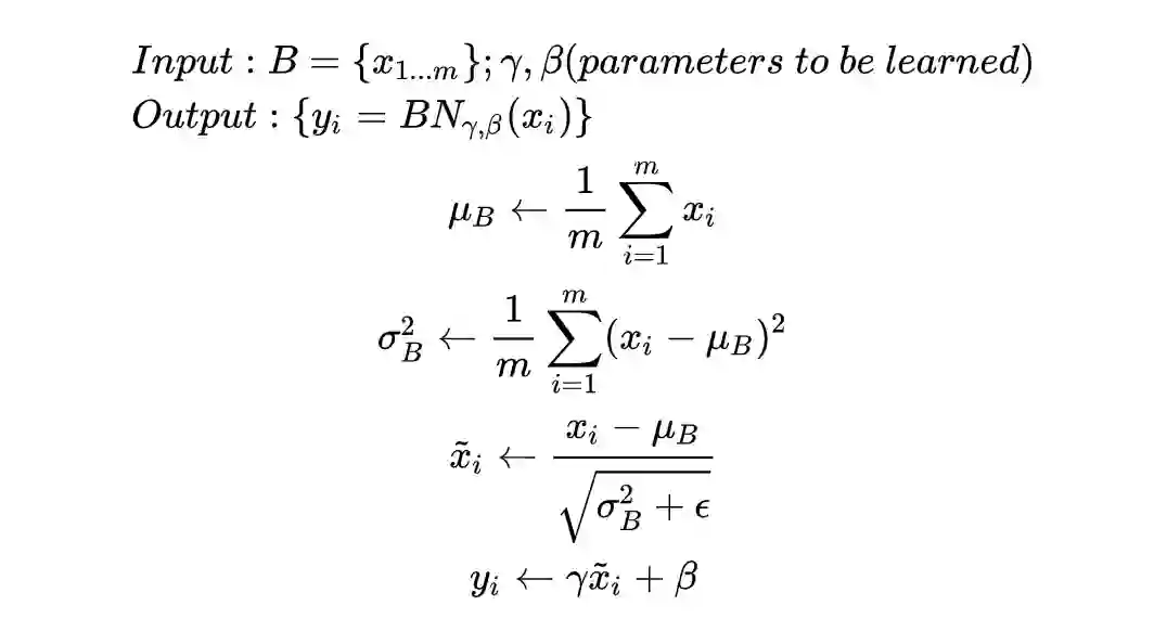 然而实现起来并不是那么简单的。如果仅仅使用上面的归一化公式,对网络某一层 A 的输出数据做归一化,然后送入网络下一层 B,这样是会影响到本层网络 A 所学习到的特征的。打个比方,比如我网络中间某一层学习到特征数据本身就分布在 S 型激活函数的两侧,你强制把它给我归一化处理、标准差也限制在了 1,把数据变换成分布于 s 函数的中间部分,这样就相当于我这一层网络所学习到的特征分布被你搞坏了,这可怎么办?于是文献使出了一招惊天地泣鬼神的招式:变换重构,引入了可学习参数 γ、β,这就是算法关键之处: