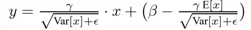 这里的均值和方差已经不是针对某一个 Batch 了,而是针对整个数据集而言。因此,在训练过程中除了正常的前向传播和反向求导之外,我们还要记录每一个 Batch 的均值和方差,以便训练完成之后按照上式计算整体的均值和方差。最后测试阶段,BN 的使用公式就是:
