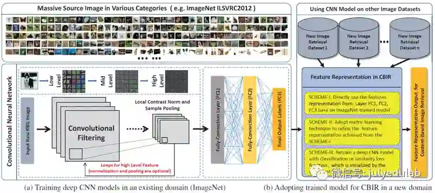 上图可以看出,CBIR应用主要是使用深度学习对图片的特征提取,有三种使用方式:1)直接使用;2)通过相似性学习来进行改善;3)通过重新训练模型来进行改善。