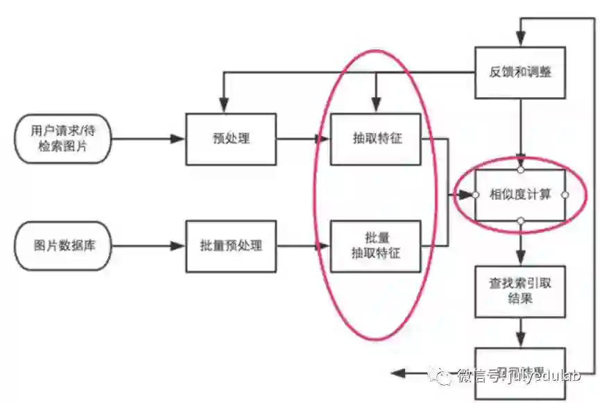 图像检索过程简单说来就是对图片数据库的每张图片抽取特征(一般形式为特征向量),存储于数据库中,对于待检索图片,抽取同样的特征向量,然后并对该向量和数据库中向量的距离,找出最接近的一些特征向量,其对应的图片即为检索结果。这其中我们可以看出红圈标注的就是整个系统的核心。