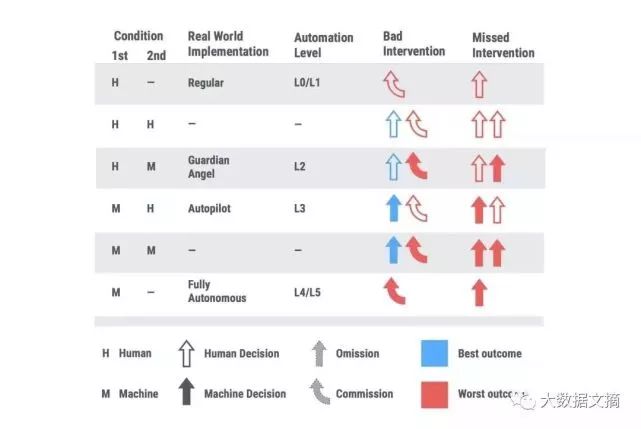 他们研究了6种驾驶模式,分别是单人驾驶模式、单机驾驶模式(全自动驾驶汽车)以及双驾驶员(两个人类或两个机器)的不同组合模式。这些模式分别对应无人车的6个等级,从L0到L5。比较典型的是,L2级的丰田Guardian Angel被归类为H-M模式,即人类(H)是主驾驶,机器(M)是副驾驶;L3级的特斯拉Autopilot被归类为M-H模式,即机器是主驾驶,人类是副驾驶。