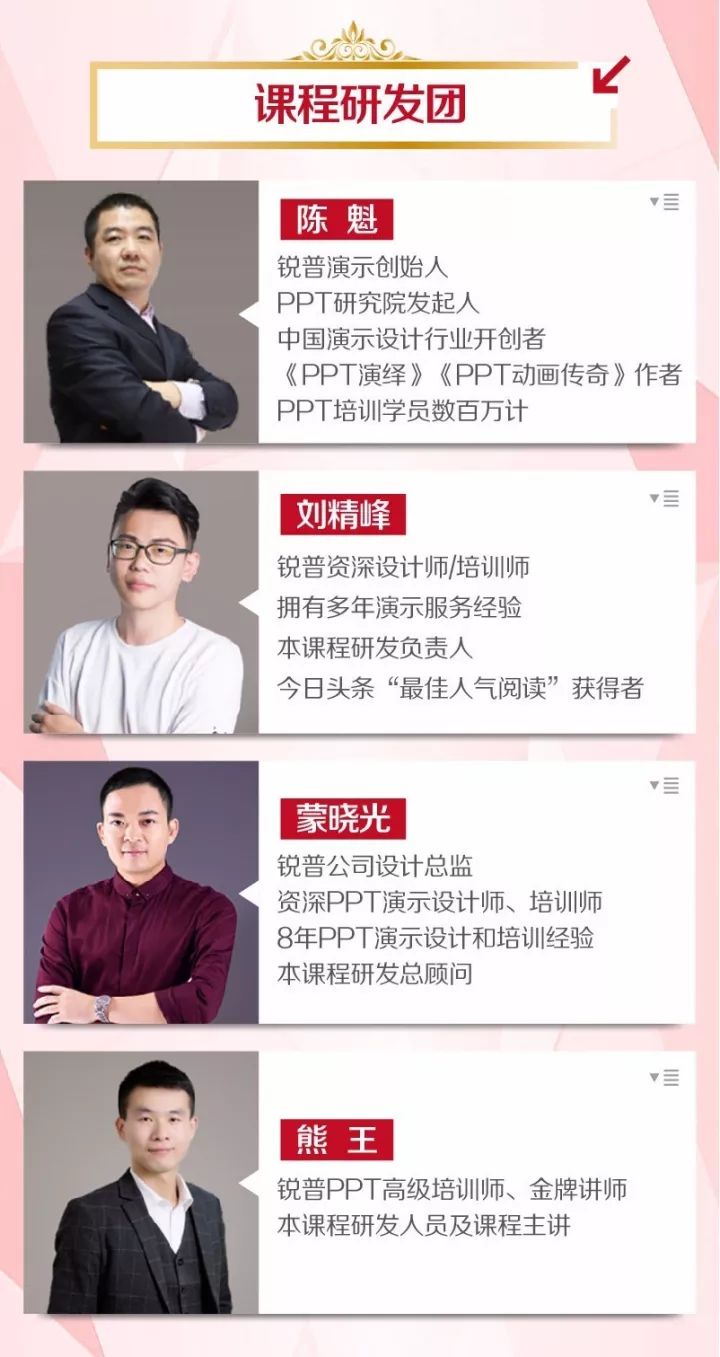 在这套课程里,陈魁将用10年的实战经验告诉你,PPT不仅是一门具体的知识,更是一种思维体系,有逻辑、有内涵!