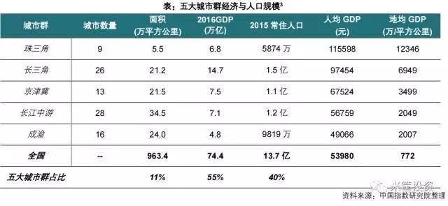 占国土面积11%、人口40%的五大城市群经济总量占全国55%,占了中国的半壁江山。而京津冀、长三角、珠三角三大城市群以3.6%的国土面积集聚了全国18%的人口、创造了全国35%的国内生产总值,无疑是领头羊。