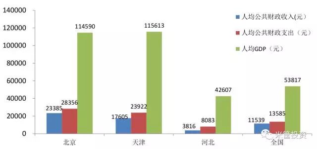 从GDP、人均GDP、人均收入等指标看,京津冀中北京、天津、河北三个地区差异较大,河北大部分城市的人均收入、财政收入都在三大城市群中排名靠后,且远低于京津冀平均水平,成为明显的洼地。而长三角各省城市虽有差异,但落差较小,属于较均衡的地区。