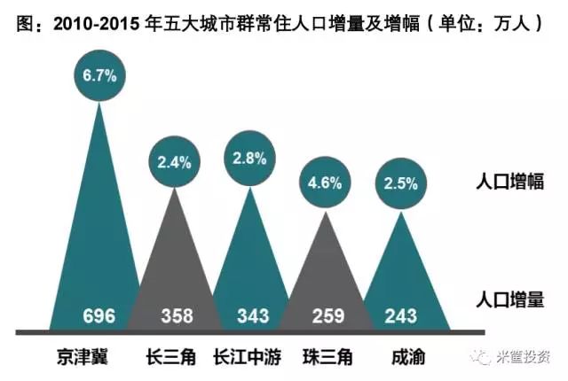 从人口增量来看,京津冀城市群受益于北京、天津两大城市人口的快速增长,五年常住人口增加近 700 万,人口凝聚力居首;珠三角城市虽然面临制造业向内陆转移的压力,但 2015 年人口规模相对 2010 年仍增长 4.6%,人口吸引力突出。