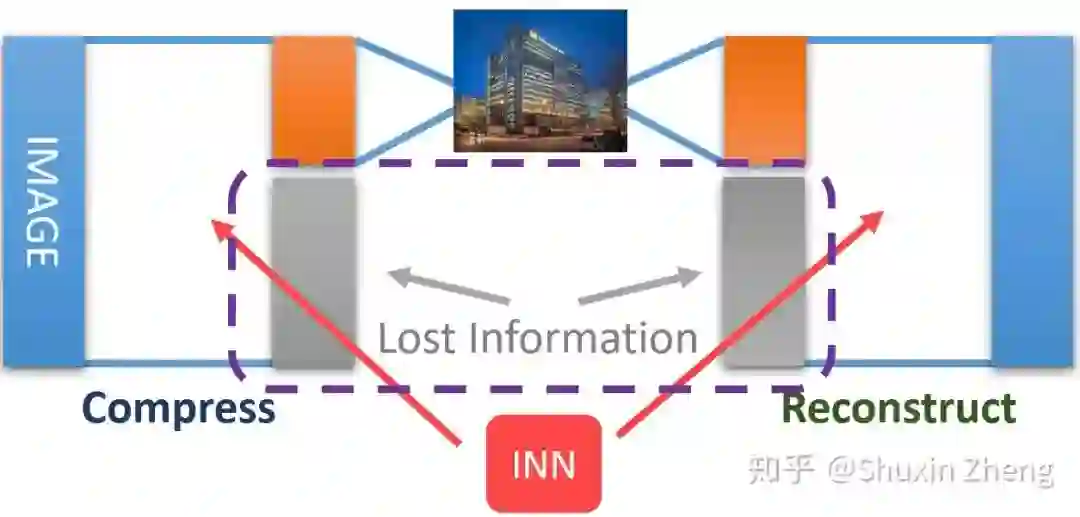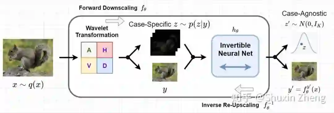 为什么这是一个病态问题?这是因为在降采样的过程中存在着信息的丢失(information loss), 以至于无法很好地还原回原图。而前人的做法一般是使用一个超分辨率的卷积神经网络,尝试从大量的数据中强行学习低分辨率到高分辨率的映射关系;或者使用encoder网络对原图进行降采样,同时使用decoder网络还原图片,二者进行联合训练(jointly training)达到更好的效果。但以上这些方法都没有从本质上解决病态问题,效果也不尽如人意。因此我们需要更聪明的方法来解决病态问题。