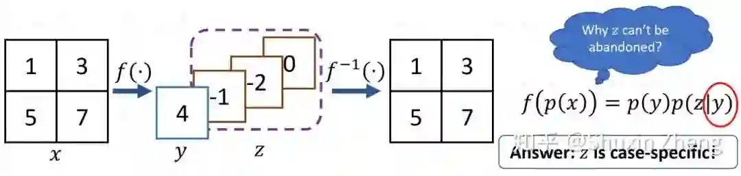 对于深度学习模型这样一种复杂的非线性函数,它的反函数是什么呢?这里我们要用到可逆神经网络(Invertible NN, INN)模型。对可逆神经网络模型不熟悉的同学,推荐阅读Lilian Weng的博客:Flow-based Generative Model. 我们采用了最简单的Normalizing Flow的形式。这里需要注意,flow-based模型是严格可逆的。从另一个角度来思考这个问题,降采样和升采样本来就是一对逆任务,是否便应当使用可逆神经网络?