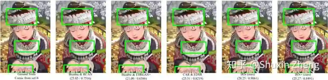 除了性能的大幅提升,更重要的是,得益于建模方法尝试直接解决任务的本质问题,模型所需参数量只需前人方法的1/10~1/30。下面是效果的可视化,请注意绿色框中对原图的还原程度。