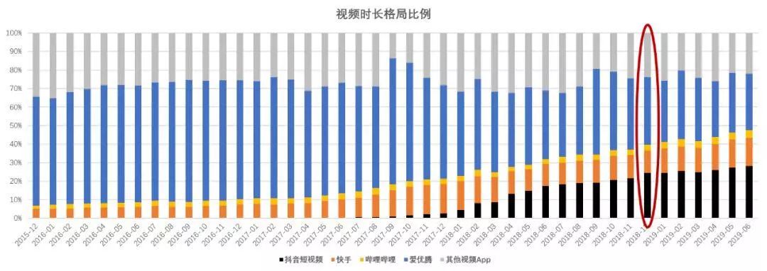 2018年12月,抖音快手单月时长在视频领域的占比第一次超过了爱优腾三家