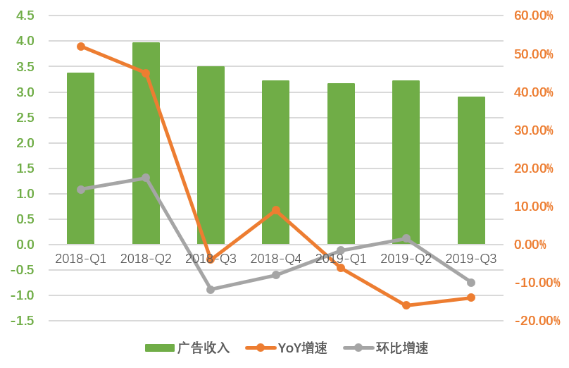 爱奇艺广告收入增速自18年Q3开始断崖式下滑,目前环比与同比负增长