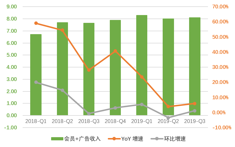 会员+广告两块收入的同比与环比增速2019年在快速下降,明显进入瓶颈期