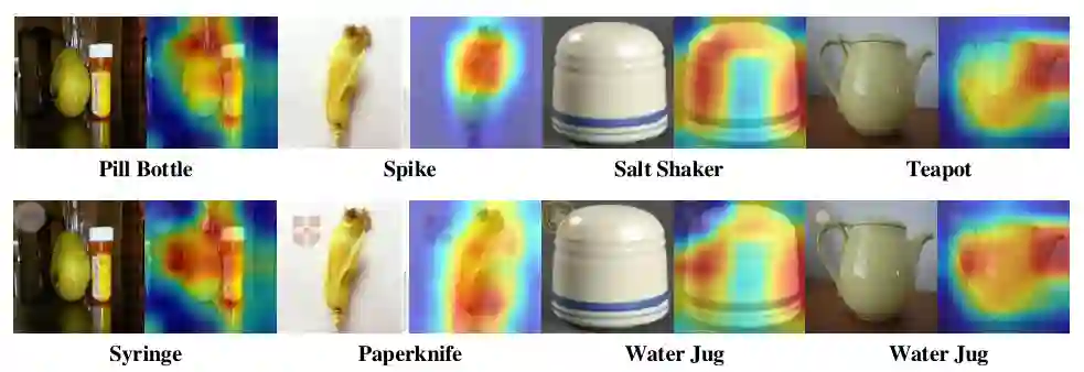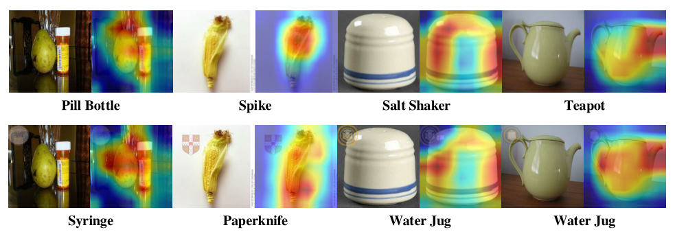 将对抗水印嵌入到图像中,可以改变生成的热图上概率分布。其中图中的第一行是原始图像(通过Resnet101正确分类)及其对应的热力图,下排是带有可见水印的对抗性图像及其对应的热图。