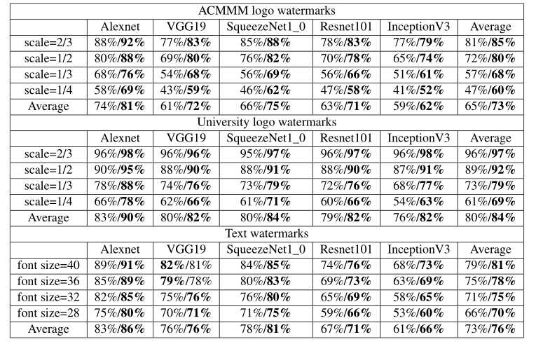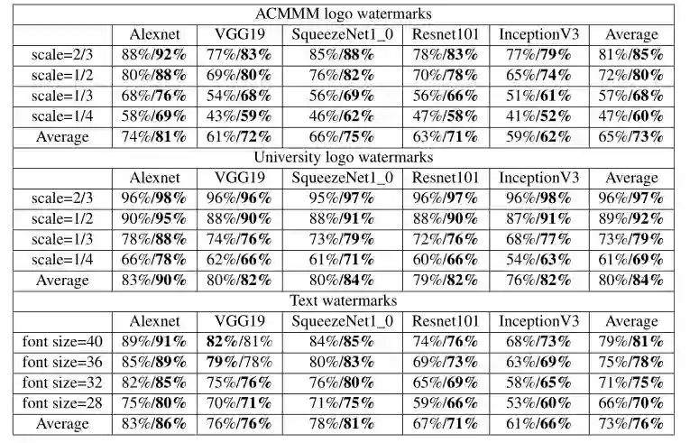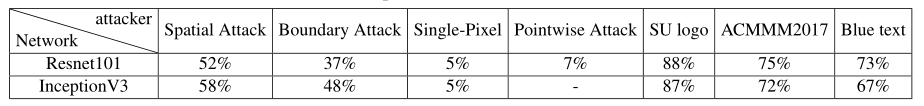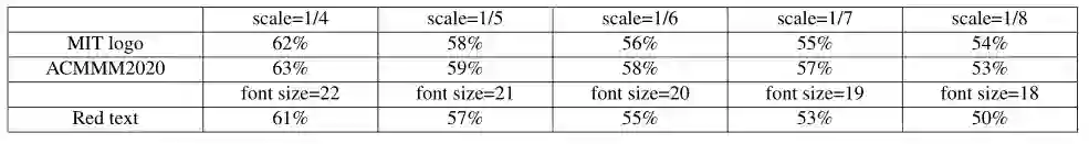 实验结果显示,当水印大小为宿主图像大小的4/9(个人感觉扰动的像素过多,有点违背对抗样本的定义)时,它可以获得97%以上的攻击成功率。水印大小是宿主图像大小的1/16,也可以达到65%左右的攻击成功率。
