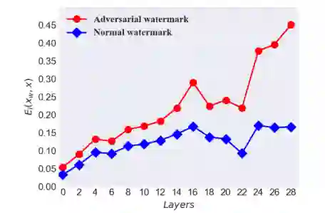 作者提出了一种新的对抗样本算法Adv-watermark。水印同时具有水印特性(版权保护)和对抗样本的功能(导致训练好的模型误分类),需要注意的一点在于除了水印区域并没有其它的对抗扰动。