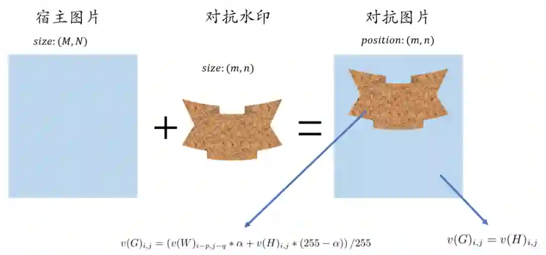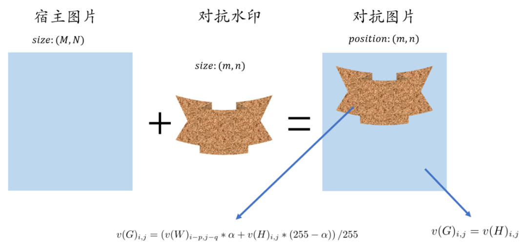 论文中使用除了R,G,B以外还有alpha共四个混合通道来生成对抗水印, 通道是指背景图像中前景区域的透明度。论文中用 表示alpha通道的值, 表示尺寸为 的宿主图像(称为宿主图片很准确即为无对抗扰动的图片), 表示尺寸为 的水印图像, 表示生成的图像,当 , 时,其生成对抗水印公式为:
