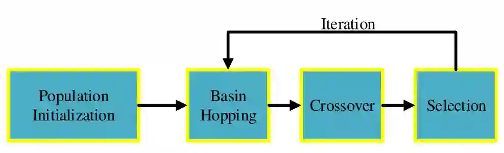 Basin Hopping是一种随机优化算法。在每次迭代过程中,BH生成一些随机扰动的新坐标,然后找到局部极小值,最后根据最小函数值接受或拒绝新坐标,具体的计算公式如下所示: