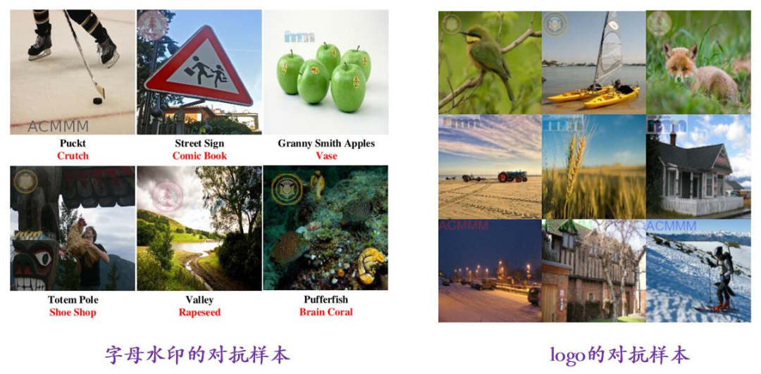 对抗样本生成的方法有很多,但它们都是在原图像上添加对抗扰动。本文提出的生成对抗样本的的方法很有趣,它是利用水印的不可察觉性,在水印上做文章从而生成对抗样本,即在干净图像中添加有意义的水印也可以攻击深度神经网络模型。如下图所示是分别是字母水印对抗样本和logo水印的对抗样本。