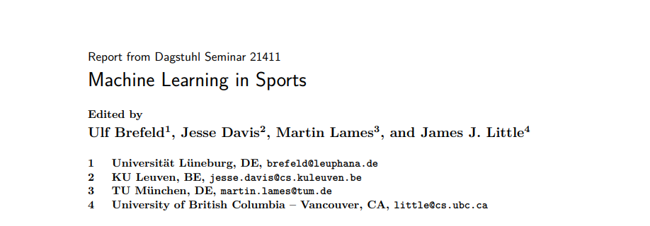 我们按照五个不同的主题组织了研讨会,每一个主题都是半天到一整天的重点。鉴于参与者在学科方面的背景不同,每个主题都以概述开始,以便让每个人都在同一页上。然后是更详细的陈述。这5个主题是:机器学习与体育运动的结合。本次会议的目标是提供一些机器学习技术(预测建模、文本挖掘)的概述,以及如何将它们应用于体育运动。ML可以发挥作用的说明性应用包括评估球队和球员的表现,支持体育转播,评估球迷对规则改变的反应,并帮助减少视频分析人员的时间负担。目的是提供运动科学基本概念的概述,以便从机器学习中为研究人员提供信息。基本概念是竞赛、训练与运动员能力的关系,不同运动项目的表现结构,以及运动实践中对支持的需求。特别是将团队运动结构解释为具有突发行为的动态交互过程,认为这是机器学习在运动领域最常见的应用领域。该课程旨在让参与者接触到通过分析视觉信息来收集团队运动信息的实践。会议开始时概述了计算机视觉在体育领域的一般应用。其中三名主持人来自业界,代表的公司在向分析制作人提供团队运动(如篮球、足球和冰球)的信息方面具有重要影响力。第四位演讲者来自学术界,讨论了相机规划和分析的材料,此外,他本人也参与了业余体育运动中视觉分析方法的技术转移。这些有经验的研究人员的讲座很好地满足了总体目标,即让参与者了解视觉的方法和应用。跨学科视角的战术会议旨在建立一个共同的理解战术及其在预测/生成模型的实施。如何在计算机模型中表示总体的长期战略仍然是一个开放的问题,在概述和贡献的演示的例子中讨论了不同的想法。一个关键的挑战是如何将机器学习模型的结果有效地传递给领域专家,这与许多此类模型的黑盒子特性相结合。这一届会议强调了实现这一目标的各种技术,并举例说明了各种运动项目,如冰球、乒乓球和足球的练习。这仍然是一个活跃的研究领域,讨论了各种经验教训和改善领域专家和技术专家之间交流的想法。