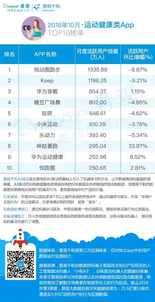 在2018年10月的运动健康App TOP10榜单中,悦动圈跑步以1335.89万活跃用户规模继续位居榜首;Keep以1196.25万活跃用户规模位居第二;位居第三的华为穿戴活跃用户规模为804.37万,环比增长达1.15%。咪咕善跑增幅明显,达到33.97%。