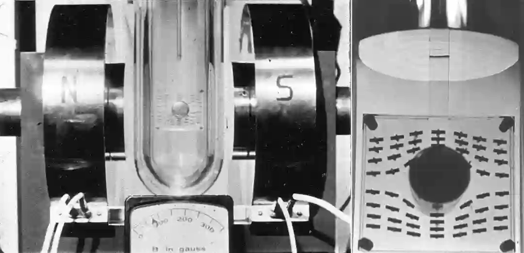 ○ 超导体完全抗磁性的实验图。在注满液氦的杜瓦瓶中,圆柱体形状的金属锡被置于磁场中,当温度从4.2 K降低至1.6 K时,电磁铁的磁场强度保持不变,但锡在大约3K时成了超导体,可以从众多小磁极的指向中看到,磁通量被排斥到圆柱体之外。| 图片来源:Wikipedia