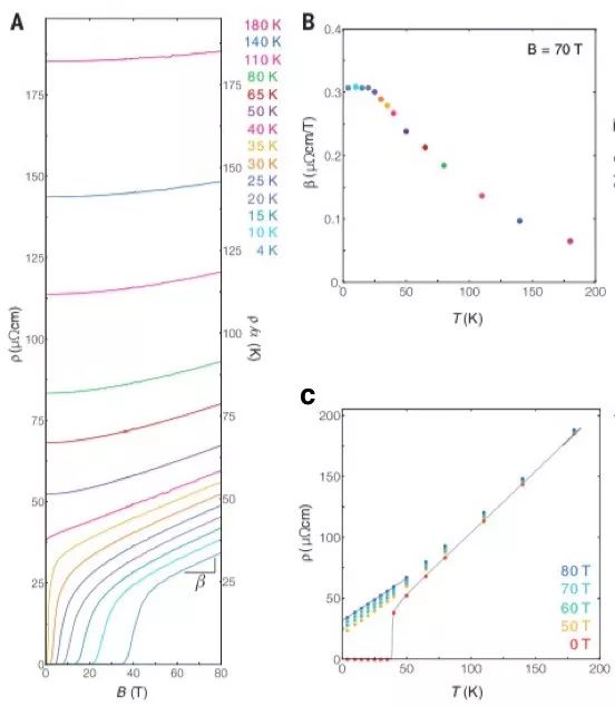 ○ (A)从4K到180K的一系列温度下,电阻率与磁感应强度的关系图。从图中可见,在普通金属态(高于转变温度,低磁场下的非超导态),电阻率与磁感应强度成正比。(B)电阻率-磁感应强度变化率(图A中的斜率)与温度的关系,可以看到,在低温下,电阻率-磁感应强度变化率趋向饱和,也就是说,电阻率与磁感应强度成正比。(C)从0T到80T的一系列磁感应强度下,在普通金属态,电阻率与温度成正比。| 图片来源:DOI:10.1126/science.aan3178